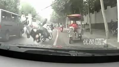 该同情他们吗!摩托车闯红灯两人被撞飞