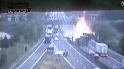 离奇车祸!大卡车失控撞车燃起熊熊大火