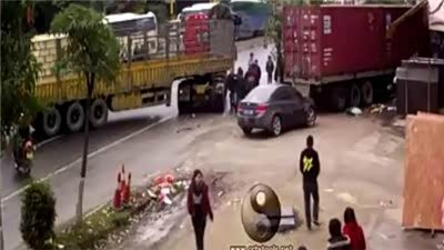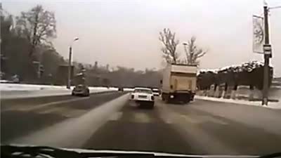 惊魂一幕!卡车冲撞致使路边轿车惨遭殃