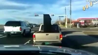 怎么不拴着?皮卡拐弯不慎摔落钢琴
