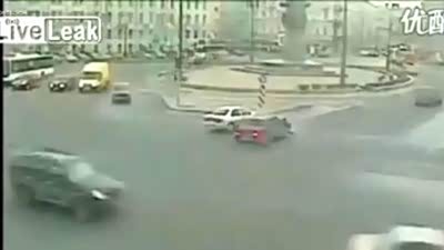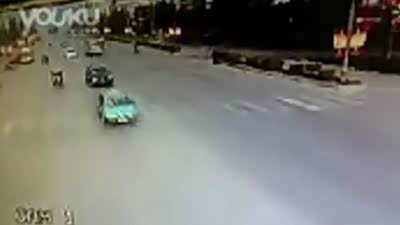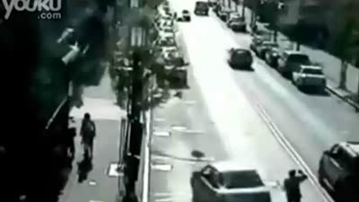 疑似电影情节 小轿车通过路口遭遇卡车