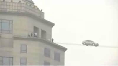 肇事汽车卡在两楼中间 吓坏驾车女士