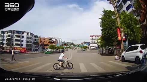 幸亏车速不快 实拍男孩骑车过马路被撞