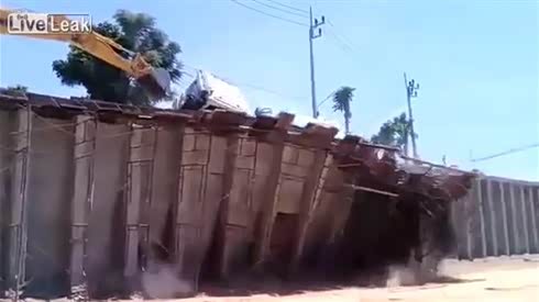 这下麻烦了 实拍水泥搅拌车翻下高墙