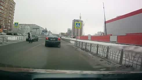 谁也不让谁 两名行人过马路被轿车撞飞