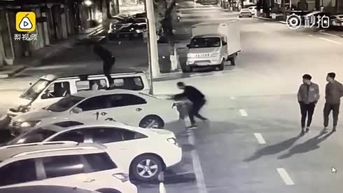 多车遭殃 醉酒男深夜耍酒疯车顶蹦迪
