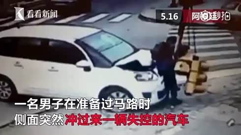 街头惊魂一幕 汽车突然失控男子被卡
