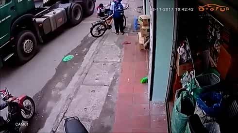 学生骑自行车不慎摔倒 险遭大货车碾压