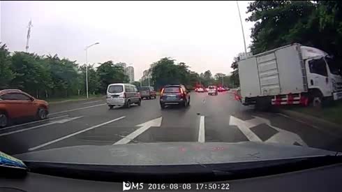 汽车从拖吊车上意外掉下 摩托无辜遭殃