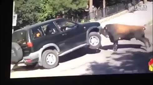 乘客吓得不轻 实拍疯狂公牛欲顶翻SUV