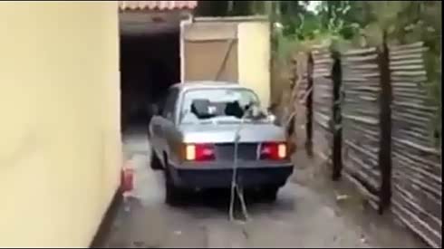 代价真不小 用车拔木桩却砸碎后风挡