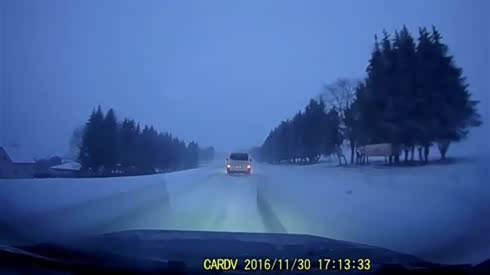 太吓人 实拍大货车雪地失控冲进沟里