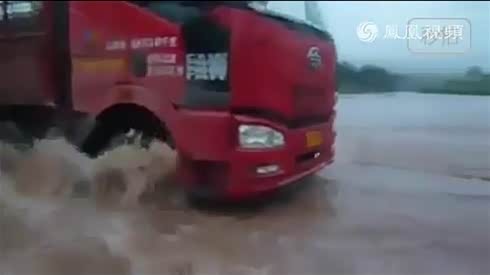 (凤凰宽频)实拍大卡车雨天涉水前行 在路上侧翻消失