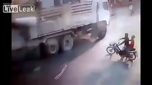 大难不死 屌丝骑摩托车钻到了货车轮下