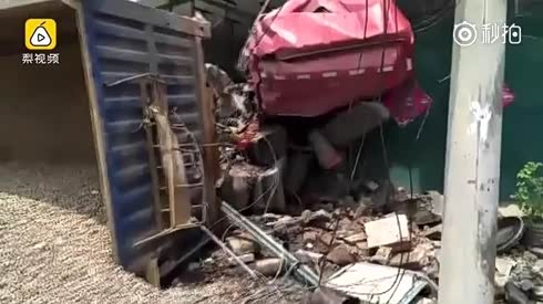 半挂车撞上路边楼房 车毁楼残司机断腿