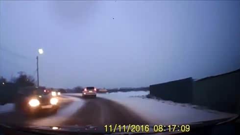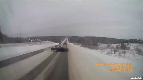轿车打滑迎面而来 摄像车惨被撞下马路