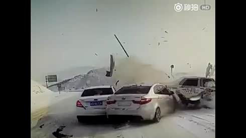 惊险一幕!实拍小轿车侧滑撞飞两车
