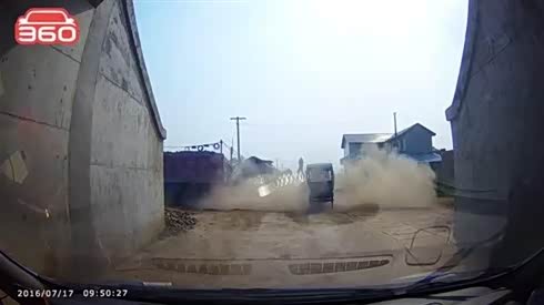 真是吓人一跳!三轮车路遇大卡车爆胎