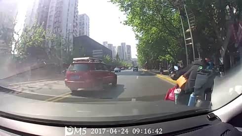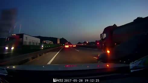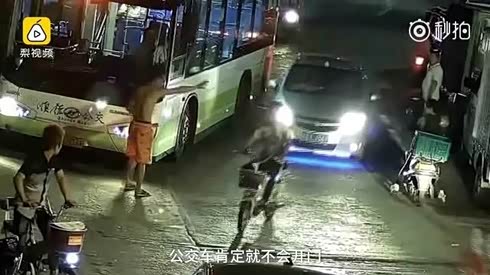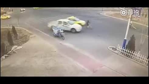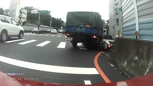 十分惊险 实拍拐弯大货车刮倒小摩托