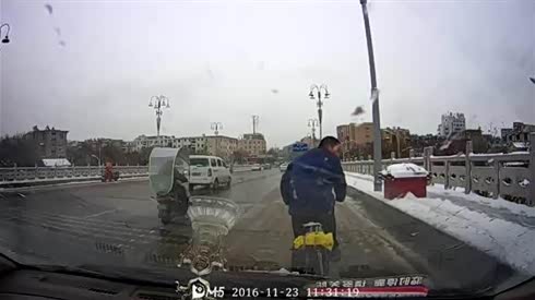 这回摊上事了 轿车刹车不及撞上骑车人