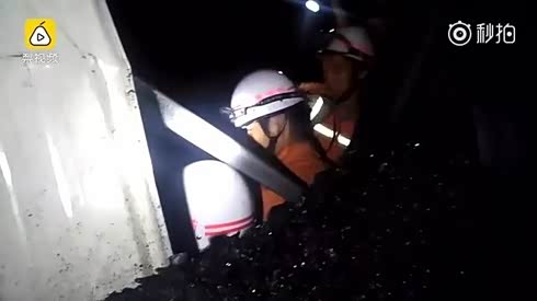 拉煤车掉入7米深沟 消防救援成花脸