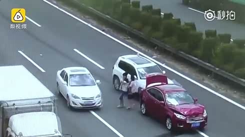谨防二次车祸 夫妻抱娃横穿高速险被撞