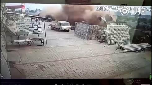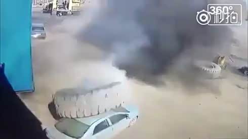 犹如爆破现场 轮胎爆炸飞出砸毁轿车