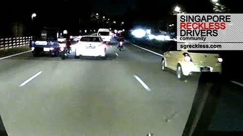 夹缝中求死 摩托从两车缝隙中穿越失败