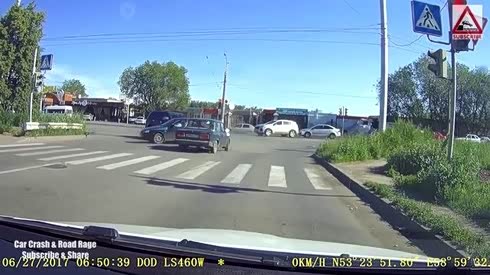 十字路口两车相撞 大叔抱小孩一旁围观