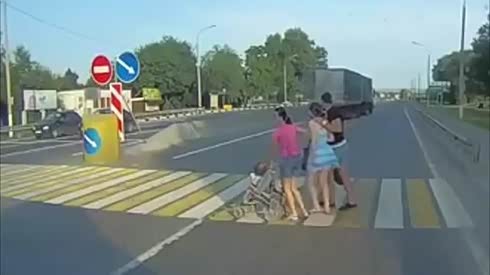 差点就丧命 货车紧贴婴儿车呼啸而过