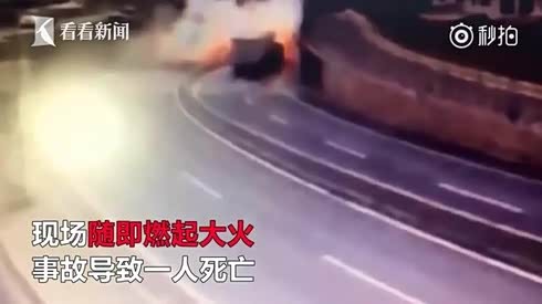 实在刹不住 卡车侧翻被追尾瞬间爆炸