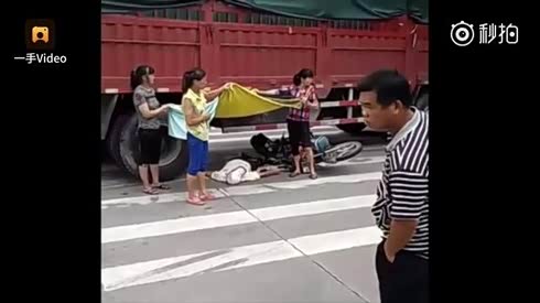 血腥一幕 摩托卷入大货车底乘客腿压断