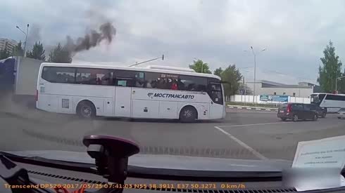 后背冒冷汗 货车司机心太大猛撞大巴