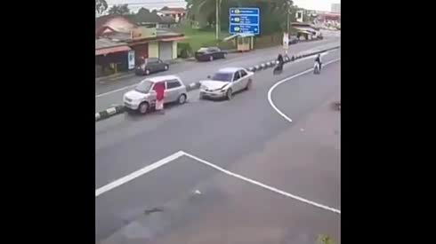 14秒开始 轿车撞翻摩托是故意的吗?