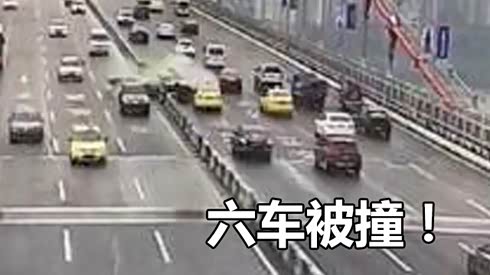 一片狼藉 轿车撞毁中间护栏致6车事故