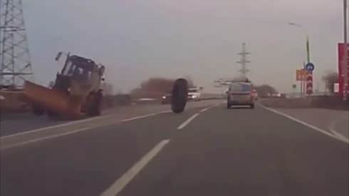 吓得直叫 女司机险撞挖掘机飞落车轮