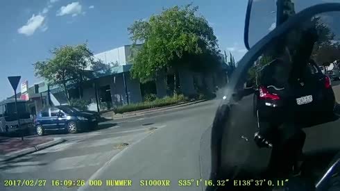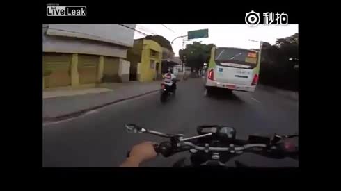 捡回一条命 摩托车手从大巴车轮下逃生