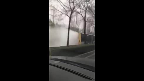 烟雾弥漫 公交车行驶途中尾部冒浓烟