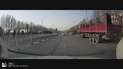 侥幸躲过一劫 骑车人路口险被货车辗轧