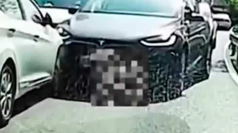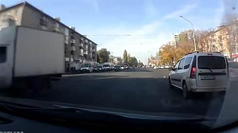 司机双脚朝天摔下 摩托车撞上拐弯轿车
