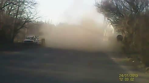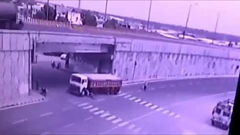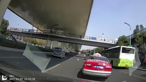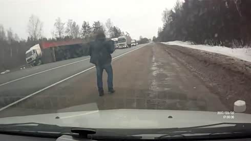 太吓人了!摄像车拐弯处遇见货车侧翻