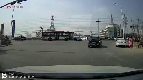 轿车十字路口抢红灯 被公交车拦腰撞上