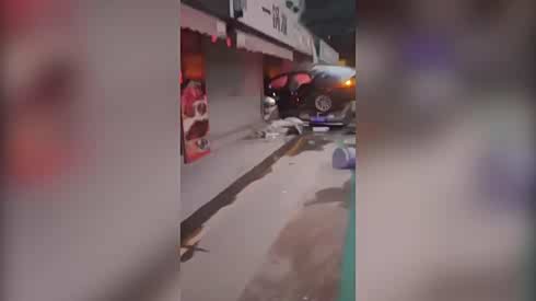 两车相撞 其中一车猛地冲进了修理店