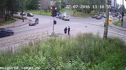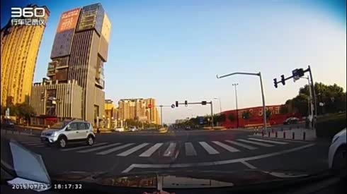 还好速度不快 看路口轿车撞翻电动车