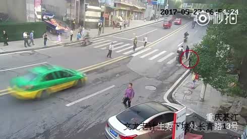 防不胜防 老太小跑过马路被摩托车撞倒