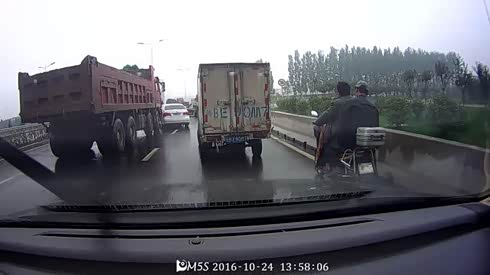 差点被逼死 摄像车被大货车挤出公路