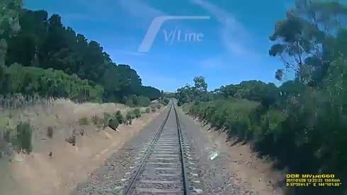 最后一秒逃生 摩托车卡在铁轨遭遇火车