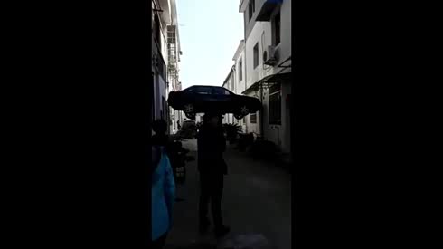 怎么开上去的 黑色轿车夹在居民楼中间
