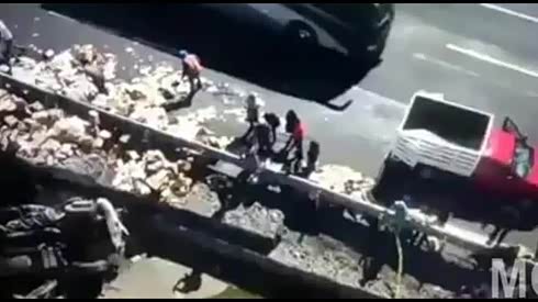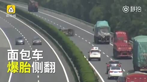 悲催!面包车突然爆胎侧翻扬起漫天尘