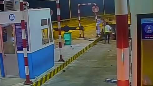 没有一点防备 看轿车撞上收费站水泥墩
